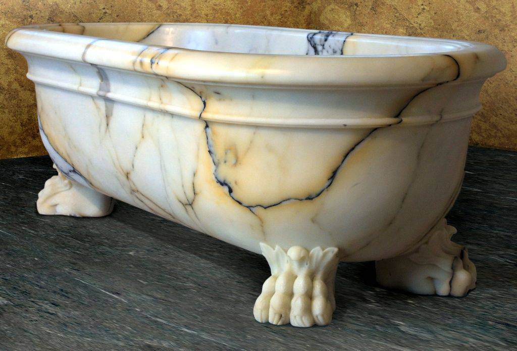 Мраморная ванна бывает из натурального камня, или искусственных материалов под мрамор. Как это ни парадоксально, но вариант из искусственного мрамора намного прочнее и лучше натуральной.