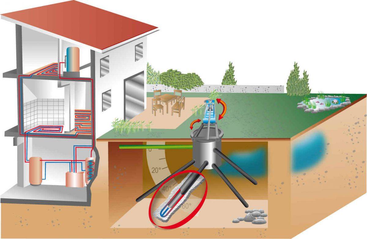 В данной схеме трубы погружаются в землю на глубину, где на протяжении всего года температура удерживается на уровне 7-10 градусов. Коллекторы могут располагаться вертикально и горизонтально. В 1-ом случае предстоит бурить несколько очень глубоких скважин, во втором – укладывать змеевик на определенной глубине.