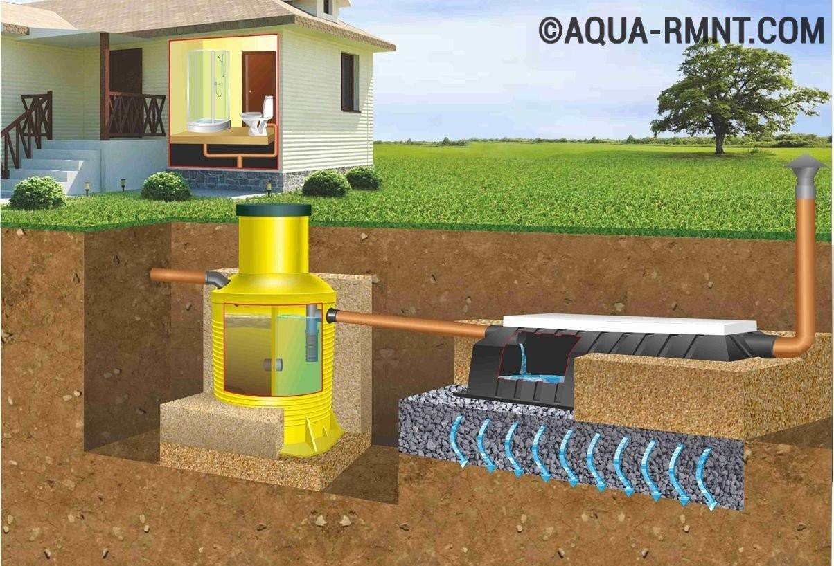 - если очищенную воду не планируется вторично использовать, что сооружается дренажный колодец или поле фильтрации. Если поблизости от участка есть естественный водоем, то очищенную воду можно сбрасывать непосредственно туда. Для этого от септика также прокладываются трубы;