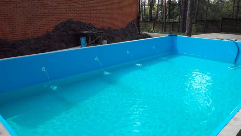 Далее чаша обрабатывается так же, как и монолитная конструкция: проводятся работы по гидроизоляции и отделка. В качестве декоративного покрытия можно использовать специальную ПВХ-пленку.