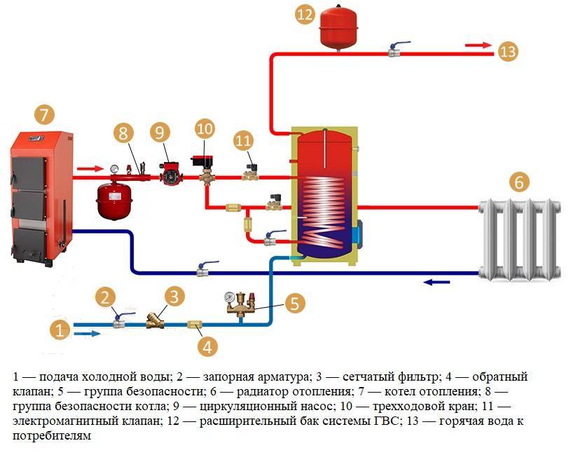 Система может работать и в обратном порядке, через змеевик может бить запитана система отопления или ГВС.