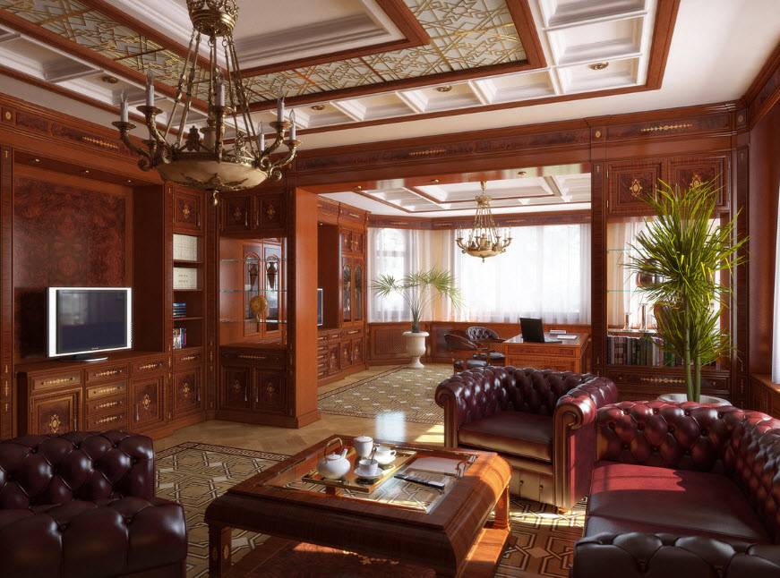 - Купеческий стиль тоже был актуальным. Базовое украшение такого направления: различные элементы фасадов, интерьеров. Конечно, тематическая мебель тоже приветствовалась. Данный стиль в наши дни – идеальное решение для состоятельных людей. Купить резьбу по дереву (а делают её вручную) – удовольствие не самое дешёвое;