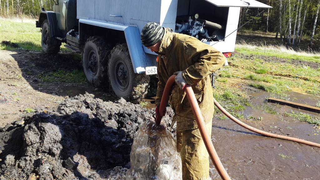- Поставьте рядом мощную помпу, которая будет перекачивать жидкость из емкости в скважину под давлением. Шланг должен быть такой длины, чтобы он лег на дно источника.