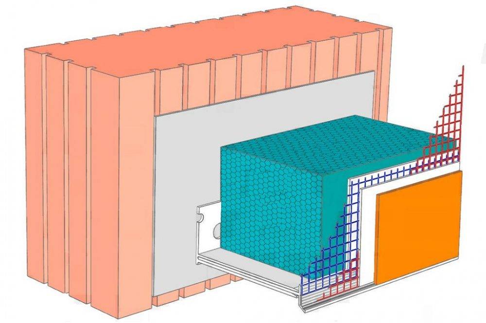 Вторая полочка обладает П-образной формой. В этот узкий паз вставляют вторую часть профиля – переднюю. С ее внешней стороны находятся водоотводный отлив и прочная армирующая стеклосетка. Такое устройство профиля позволяет регулировать расстояние между его первой и второй полочкой. Стеклосетка является дополнительным опорным элементом и необходима при оштукатуривании фасадов.