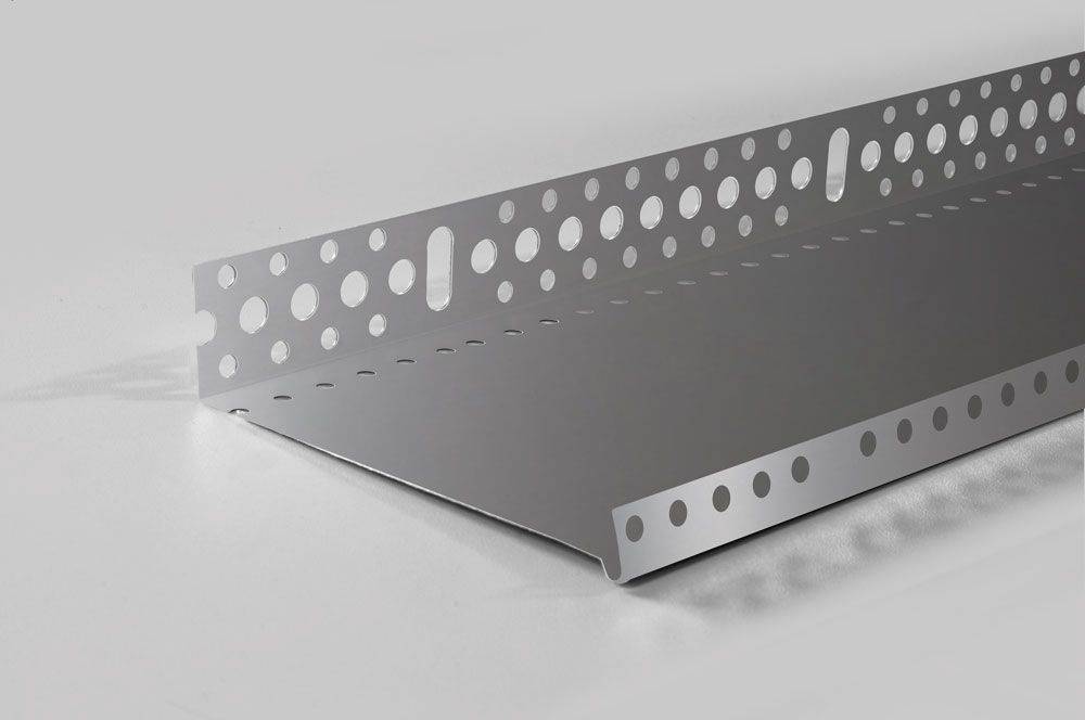 Стартовый цокольный профиль. Стартовый профиль цокольный производится в виде алюминиевого лотка для установки систем утепления и делается по толщине пенополистирольных плит или минеральной ваты. Он стойкий к коррозии потому, что сделан из перфорированного алюминия. Именно для того, чтобы приделать профиль к фасаду и прочно сцепить наружную штукатурку с утеплителем, требуется перфорация. Предназначен профиль для защиты нижнего края утеплителя от атмосферных осадков и повреждений.