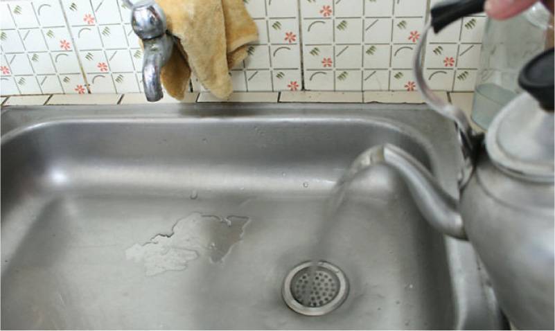 - Если трубы стальные, заливаем в сливное отверстие около 1 литра кипятка и ждем 20 минут. Чтобы прочистить пластиковые трубы, просто пускаем горячую воду из крана так же минут на 20 (температура воды не должна превышать 60 градусов). Не слишком плотно засевшая пробка должна слиться в канализацию.