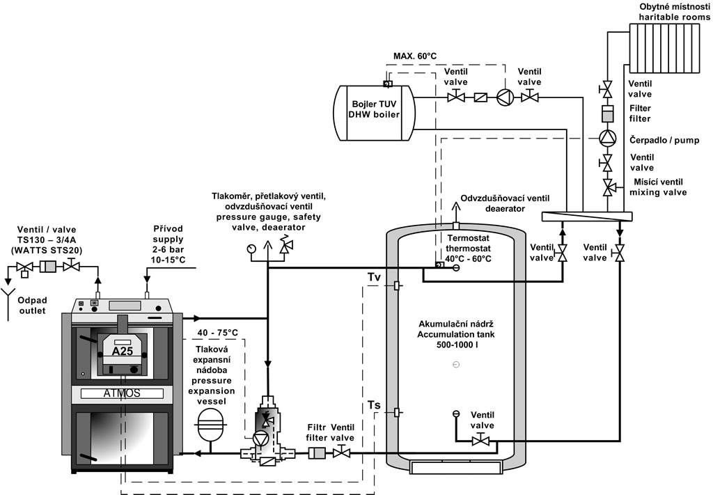 Нижний патрубок котла врезается в обратку, верхний патрубок врезается в подачу. Горение пеллет в горелке котла строго контролируется при помощи двух факторов: