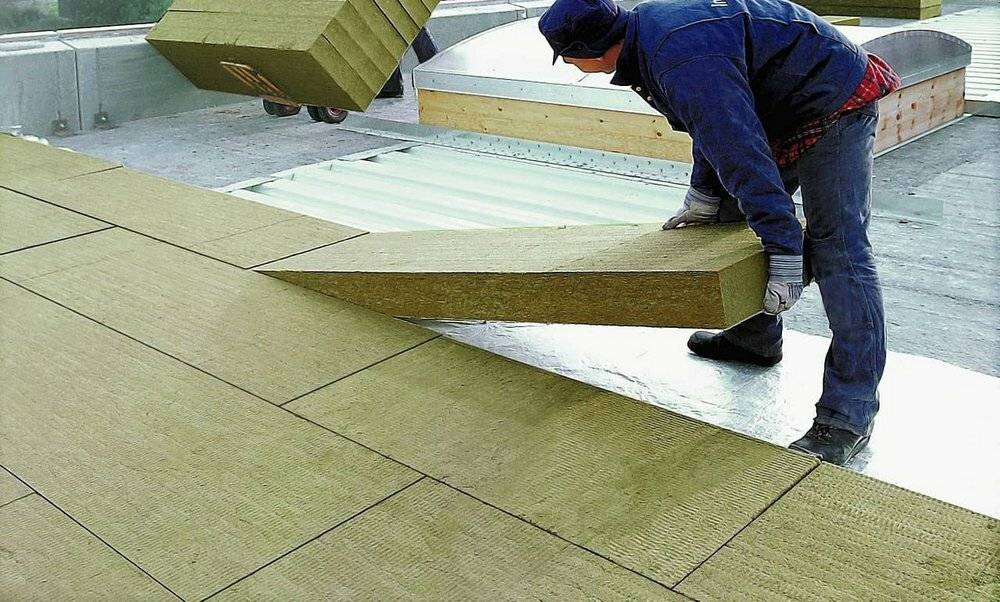 Утепление плоской кровли блоками базальтовой минеральной ваты повышенной плотности.