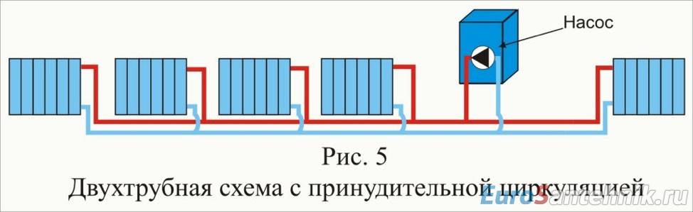 И второй тип систем водяного отопления относиться к системам с принудительной циркуляцией теплоносителя. То есть для циркуляции теплоносителя в системе используется циркуляционный насос. Без него данная система отопления работать не будет.