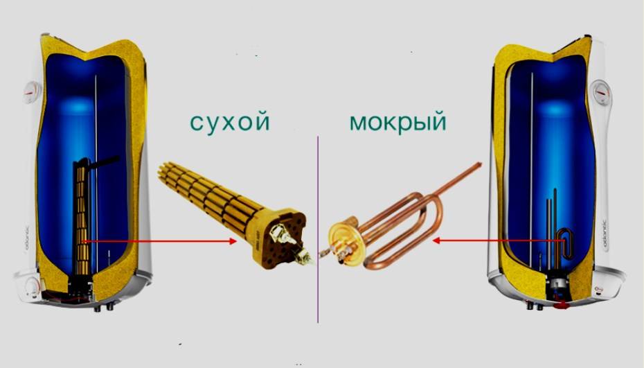 В зависимости от конструкции нагреватели подразделяются на «сухие» и «мокрые». Первые так называются из-за того, что не имеют контакта с водой — их корпус скрывает герметическая колба. Водонагреватели с сухим тэном используются для современных моделей. Производители считают такую конструкцию более долговечной, так как корпус нагревательного элемента не подвергается постоянному воздействию воды — отсутствие известковых отложений и накипи существенно продлевает срок эксплуатации ТЭН. Они не перегорят, если пользователь случайно включит бойлер без воды.