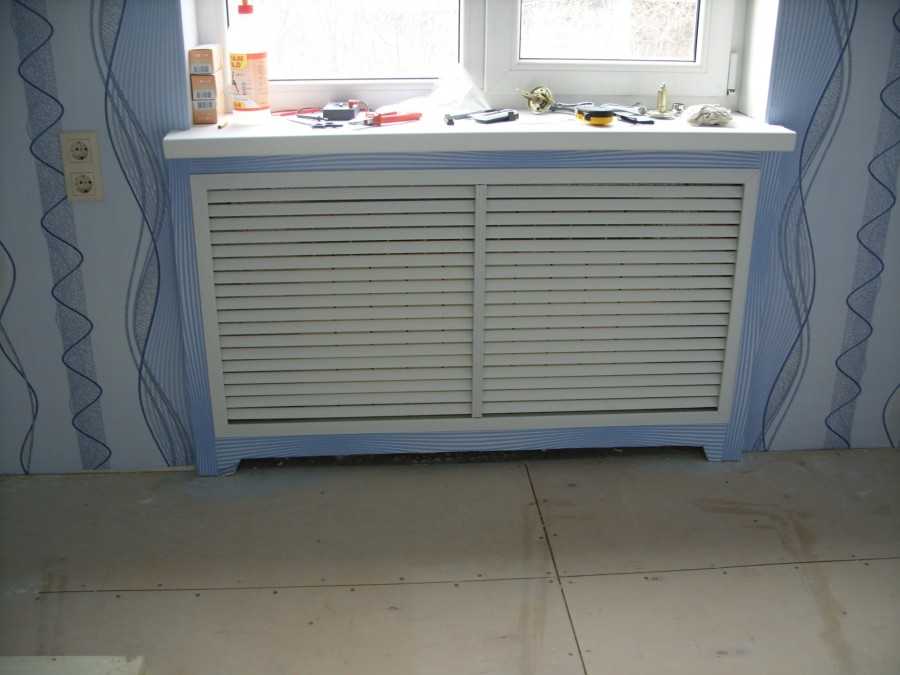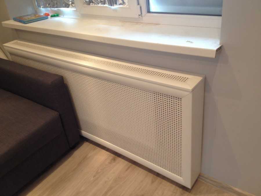 Важно не перекрывать поток теплого воздуха и применять материалы, которые не утрачивают основные качества вследствие постоянного воздействия высоких температур. Конструкции могут быть навесными и опирающимися на напольное покрытие. Эффектным дизайнерским решением является использование экрана-коробки в виде тумбы с дверцами