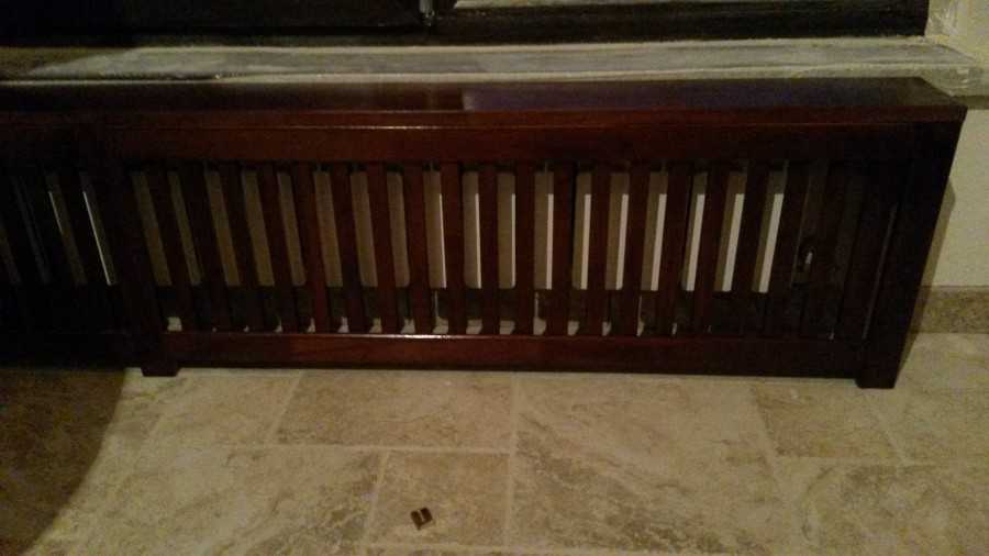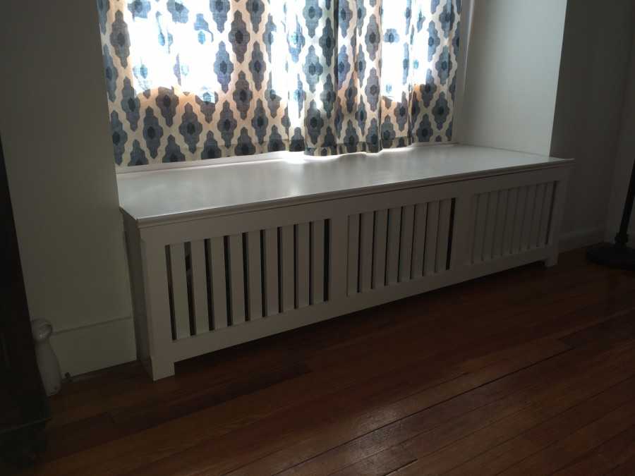 Данный вариант подходит для тех, у кого зимой сильно топят. В таком помещении не будет холодно, батарея закрыта, но теплый воздух будет выходить через задние боковые отверстия. Но если котельная работает не на 100 %, в холодное время года без горячей батареи никак не обойтись, тогда не закрывайте ее почти полностью, как в представленном выше варианте. Вам подойдет следующая идея.