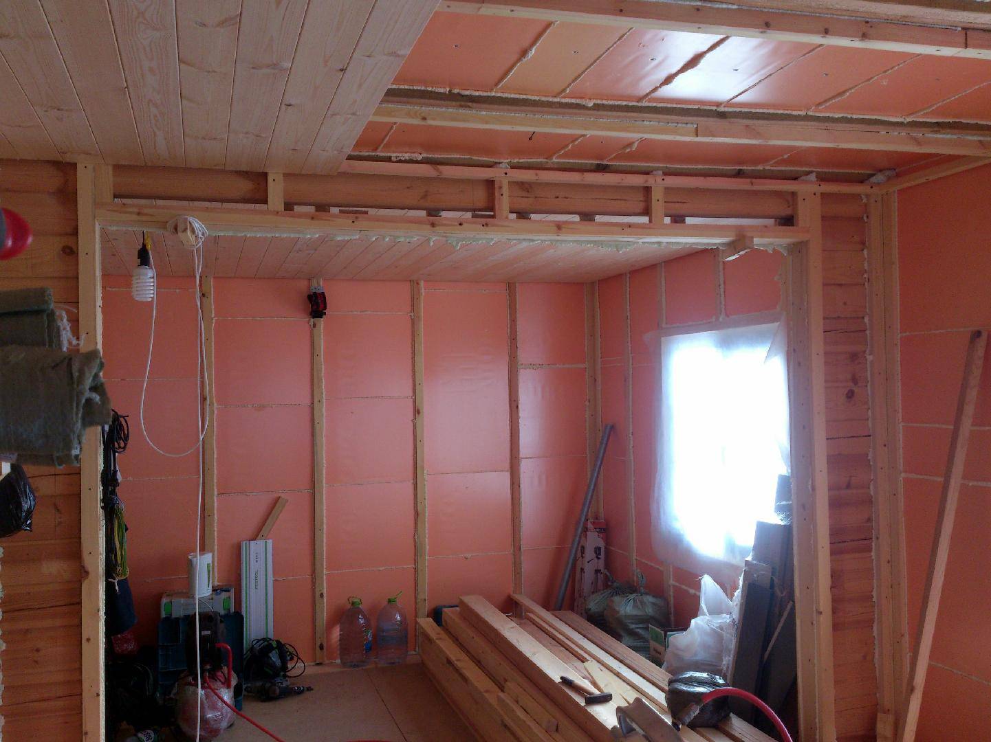 - После этого делается каркас из металлических профилей или бруса и заполняется пенопластом или подобным утеплителем. Лучше, если расстояние между металлопрофилями будет такое же, как ширина утеплителя.