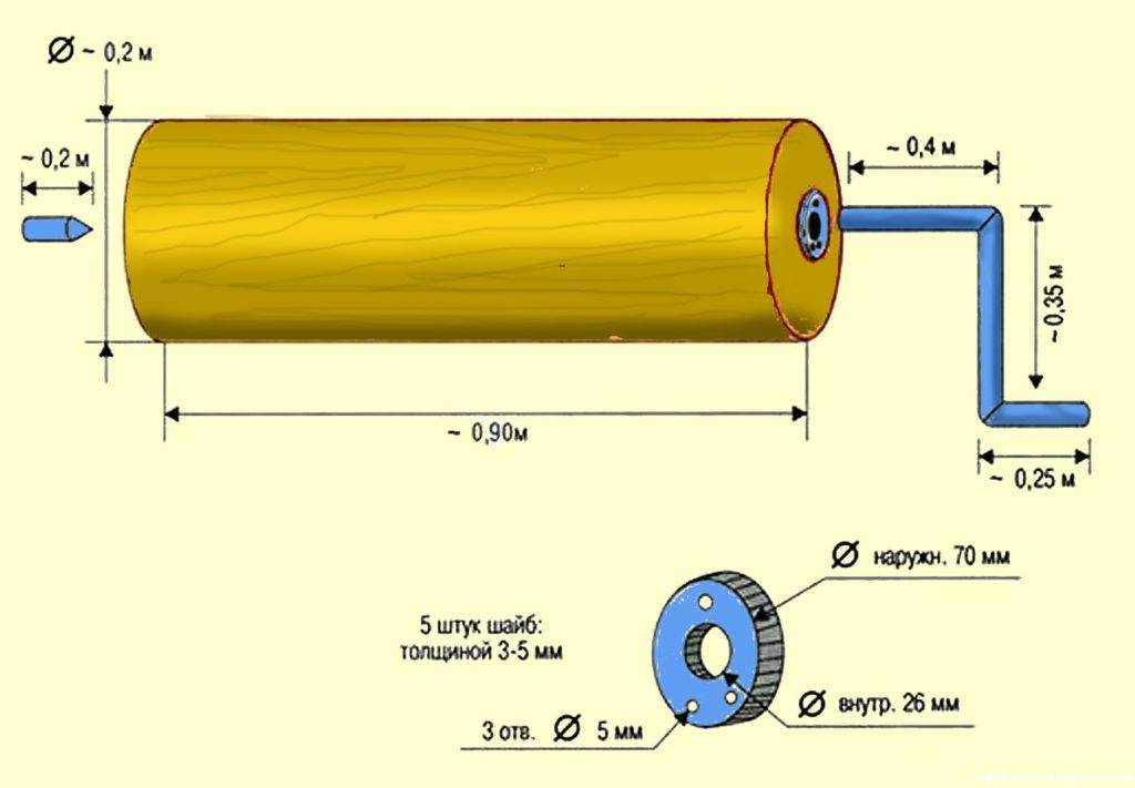 Другой вариант заключается в изготовлении цилиндра из металлической трубы шириной 20 см. С обеих сторон привариваются диски с отверстиями, предназначенные для крепления трубы меньшего сечения (она используется для вращения). С одной стороны тонкая труба изгибается в качестве рукоятки, с другой — имеет длину 5 см (для опоры).