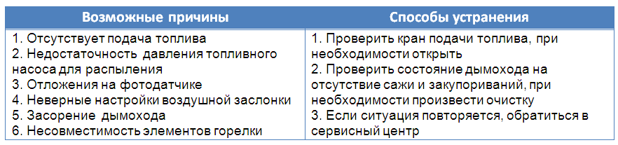 Пламя должно быть ровным. Отклонение факела в сторону говорит о необходимости замены форсунки.
