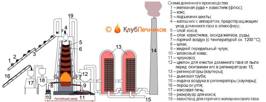 1 железная руда + известняк 2 кокс 3 лента конвейера 4 колошник с аппаратом, предотвращающим уход доменного газа в атмосферу 5 слой кокса 6 слои известняка, оксида железа, руды 7 горячий воздух (с температурой около 1200 °C) 8 шлак 9 жидкий передельный чугун 10 шлаковый ковш 11 чугуновоз 12 циклон для очистки доменного газа от пыли перед сжиганием его в регенераторах 13 13 регенераторы (кауперы) 14 дымовая труба 15 подача воздуха в регенераторы (кауперы) 16 порошок угля 17 коксовая печь 18 резервуар для кокса 19 газоотвод для горячего колошникового газа