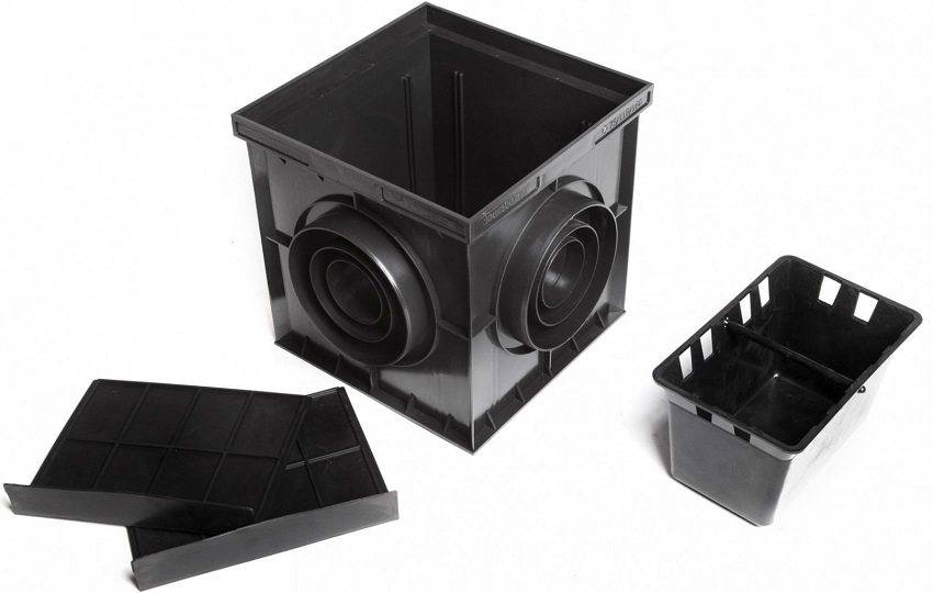 Сверху кубического дождеприемника расположена решетка. Также водоотводы этого типа укомплектованы специальными перегородками и корзинами. Перегородки-сифоны препятствуют распространению неприятного запаха из ливневой канализации. А корзины предназначены для сбора листьев и прочего мусора.