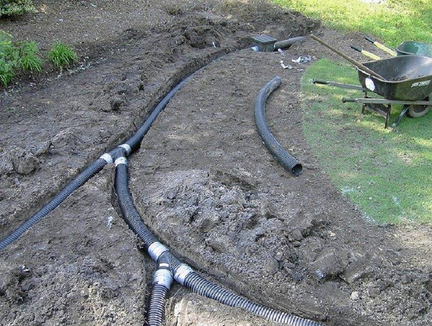 - Трубы. Устанавливаются на глубине, под землей. Попадая в них, вода перемещается в сторону колодца, монтируются также под наклоном.