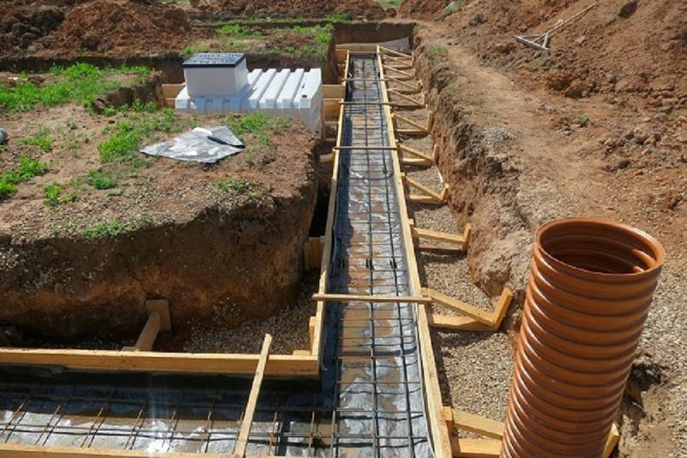 Сооружение опалубки для обустройства фундамента ленточного или плиточного типа осуществляется после укладки всех видов канализационных труб и монтажа объектов.