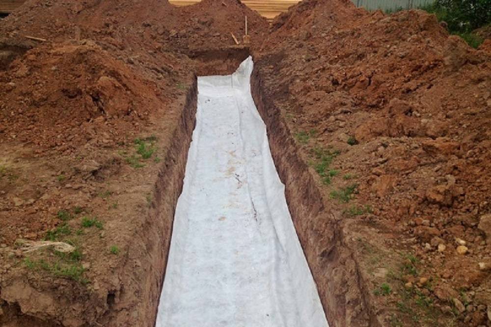 Монтаж геотекстиля на дно траншеи