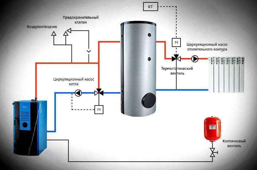 Для стабилизации температуры в системе отопления рекомендуется установить также теплоаккумулятор — накопительный бак, который будет промежуточным звеном между котлом и отопительными приборами. При этом, во время перерывов в топке котла, система не будет остывать более, чем на 10-15 градусов. Вода на входе в теплообменник должна иметь определенную производителем температуру, обычно — 60 градусов Цельсия. Для поддержания этой температуры системы оснащают трубой для подмеса горячей воды. В системах с принудительной циркуляцией на случай внезапного отключения электричества также нужно предусмотреть байпас для обхода циркуляционного насоса.
