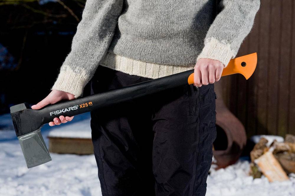 Лезвие из инструментальной стали надежно насажено на фибергласовую рукоять. Оно снабжено боковыми выступами, облегчающими раскалывание сложных поленьев.