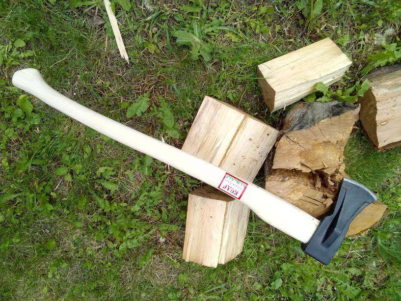 - Более длинная и массивная рукоять (топорище). Её изготавливают из прочной и гибкой древесины. Оптимальным вариантом является ясень, использование которого позволяет погасить вибрацию, возникающую при колке дров. Менее долговечны – клён, берёза, бук. Иногда для изготовления топорищ используют дуб и акацию, но эти породы лучше для данной цели не применять. Это объясняется тем, что такая древесина не способна глушить колебания в плоскости, расположенной перпендикулярно поверхности ладоней. В народе о таких топорищах говорят, что они «сушат руки».