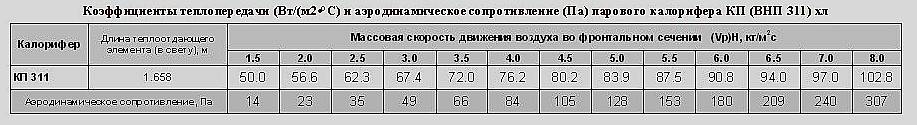 Таблица некоторых расчетных параметров парового калорифера КП (ВНП) 311 хл | ||||||