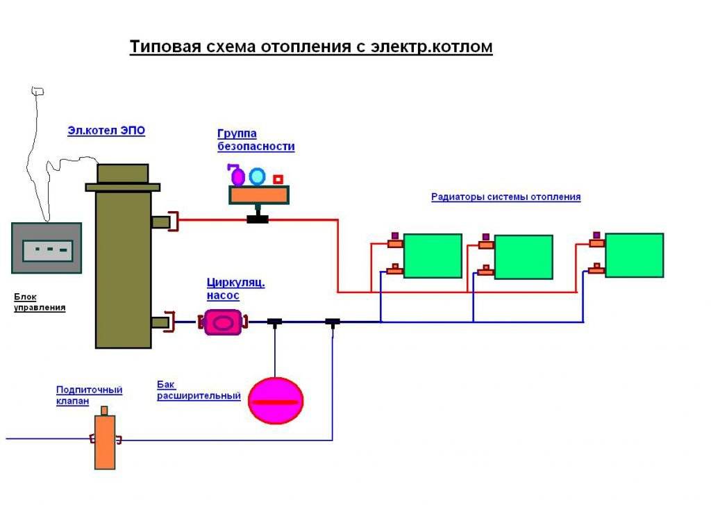 При использовании ТЭНовых электроагрегатов в моноблочном корпусе все требуемые элементы уже находятся внутри аппарата, поэтому для подсоединения к отоплению нужно подвести к соответствующим патрубкам подающую и обратную магистрали. К последней через кран врезается водопровод для подпитки системы.