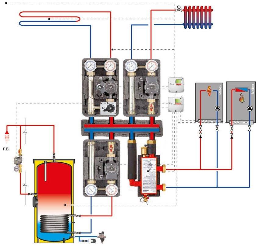 - Двухнасосная система. Смысл такого подключения в параллельной работе двух насосов: отопления и ГВС. Переключение с одного на другой происходит по сигналу того же датчика термостата. Когда работает один насос, второй перекрывается клапаном.