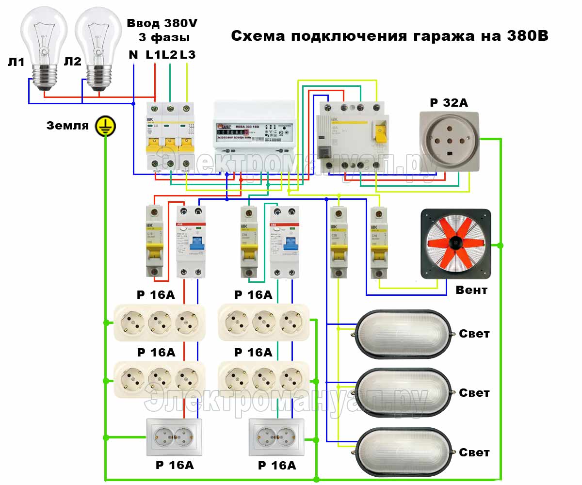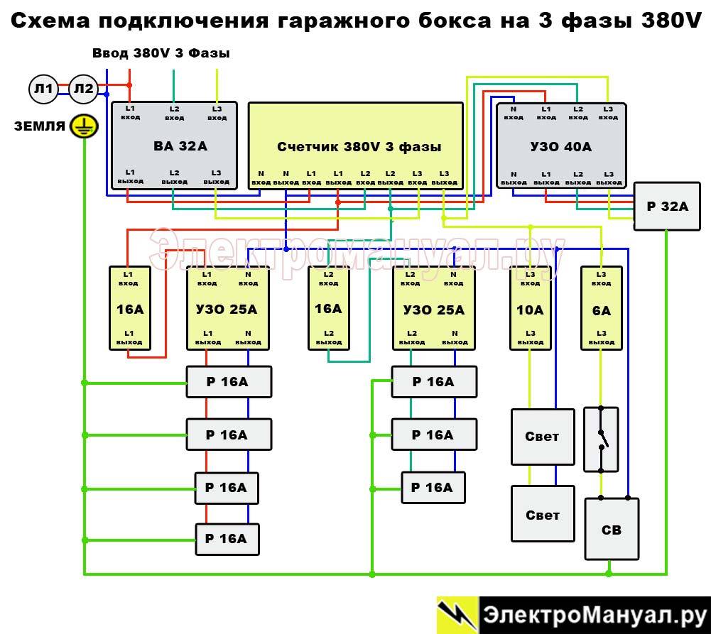 Приняв во внимание вышеизложенный факт, готовим схему питания и освещения до электронного счетчика. Прежде определяем, будет ли у вас в гараже установлены приборы, поглощающие значительное количество энергии (электросварки, печи с тенами), если да то вам необходима трехфазная система питания с рабочим показателем 380 V