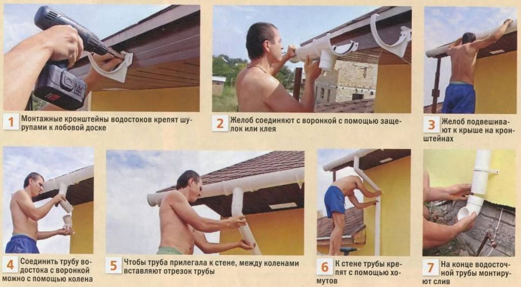 Легче всего осуществлять самостоятельный монтаж водосточной системы из пластика. Этот материал является наиболее подходящим вариантом для кровли из гибкой черепицы, так как с нее со временем смывается абразивная крошка, которая негативно сказывается на металлическом покрытии, но не влияет на пластиковое. Минусом пластиковых элементов является чувствительность к морозам.