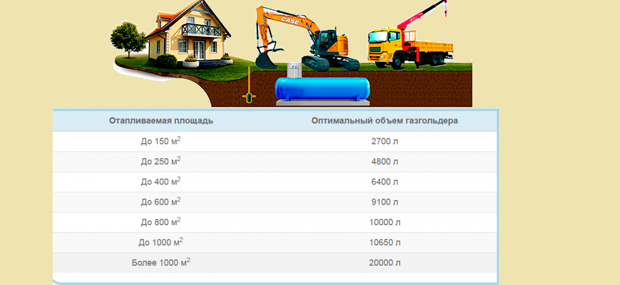Таблица для расчета отапливаемой площади и оптимального размера газгольдера.