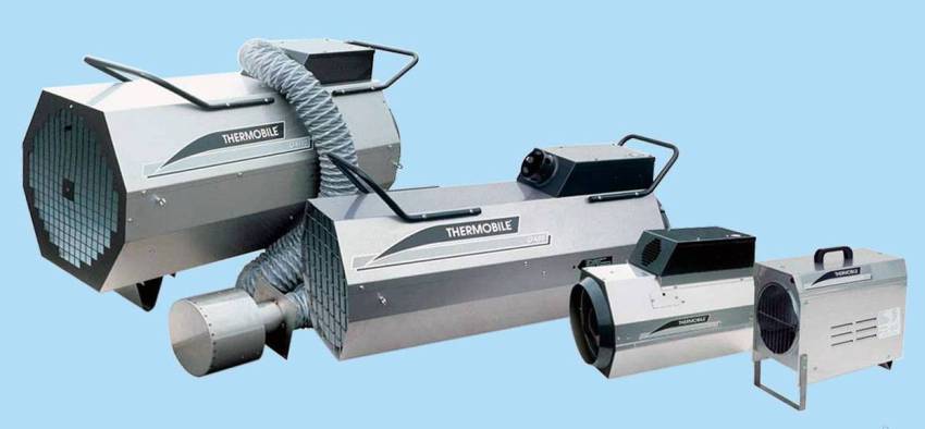 Передвижной тепловентилятор может работать на различных видах топлива: на керосине, отработанном масле, солярке, горячей воде, электричестве и сжиженном газе.