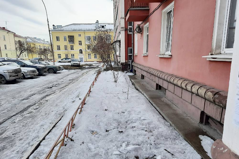 Это вход в подъезд со стороны двора. Зимой все в снегу, но летом справа и слева от входа растут цветы