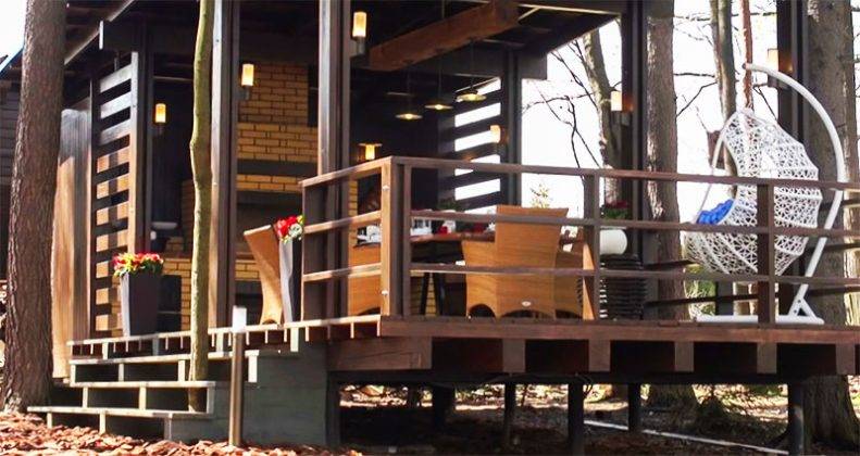 Беседку решили построить поближе к воде, для неё отвели узкую площадку размером 4×10 м, чтобы не выкорчёвывать вековые деревья. Фундамент установлен на винтовых сваях, при необходимости его можно нарастить, если понадобится пристройка. Каркас построили из вертикального бруса лиственницы, такая технология лучше всего вписывается в ландшафтный дизайн. Все деревянные элементы обработали защитными составами и покрасили краской на основе натуральных компонентов.