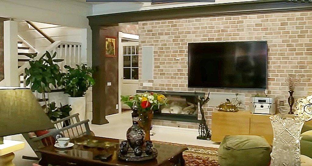 С другой стороны гостиной висит телевизор на стене, отделанной кирпичом. Там же расположен небольшой музыкальный центр. С этой стороны можно пойти по лестнице, наверх, ко второму этажу, оборудованному под спальню хозяйки и нескольких гостевых комнат.
