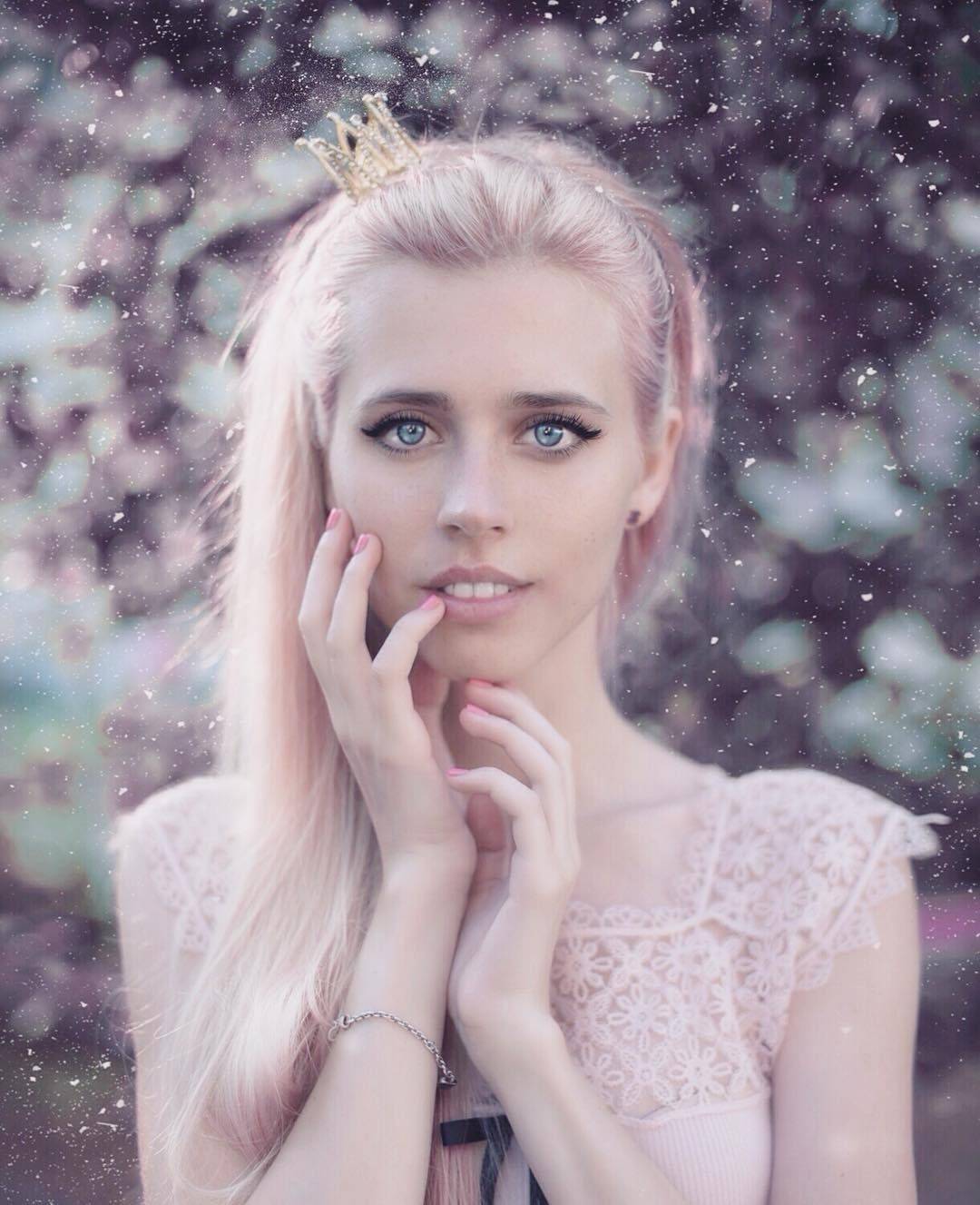 - Метода покраски волос. На самом деле, женщина вообще не красит волосы. Она натуральная блондинка, а интересный цвет появляется путем наложения спецэффектов.
