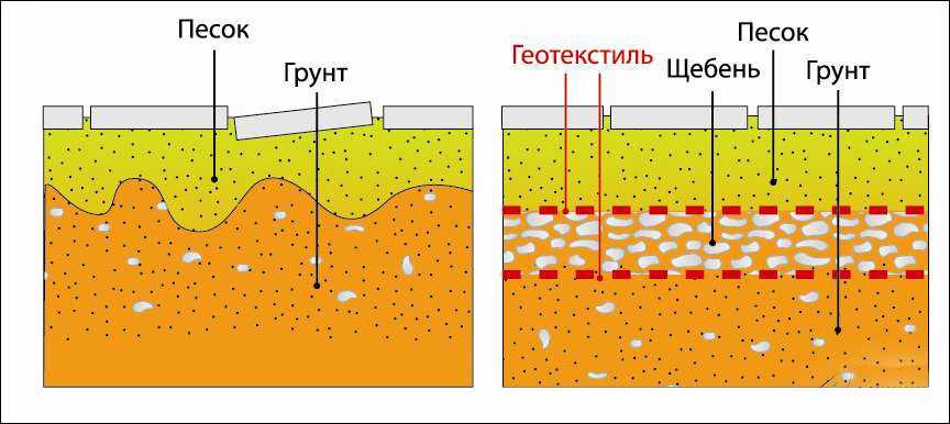 На геотекстиль насыпается слой песка, выравнивается. Затем насыпают слой крупного щебня или гравия.