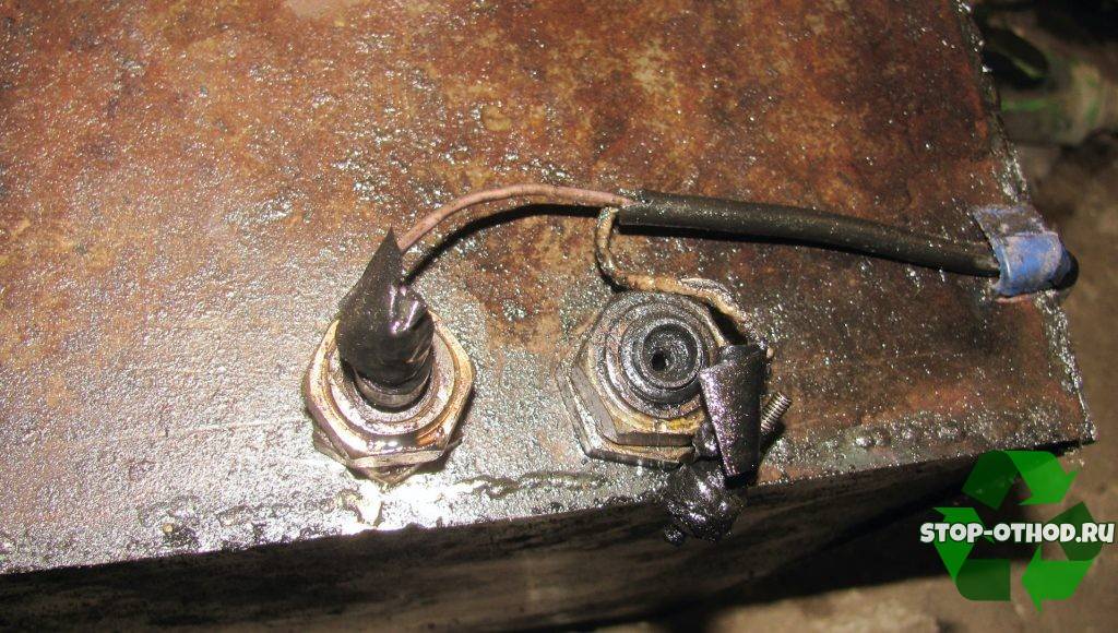 Топливный бак выполняется из стойкого к коррозиям металла, как и отстойник для горючего. Последний оборудуется трубкой, по которой отработанное масло поступает обратно в бак. В нижней части отстойника делают заглушку для слива грязного остатка. В бак встраивается ТЭН, оборудованный регулятором, который будет его отключать при 70°С.
