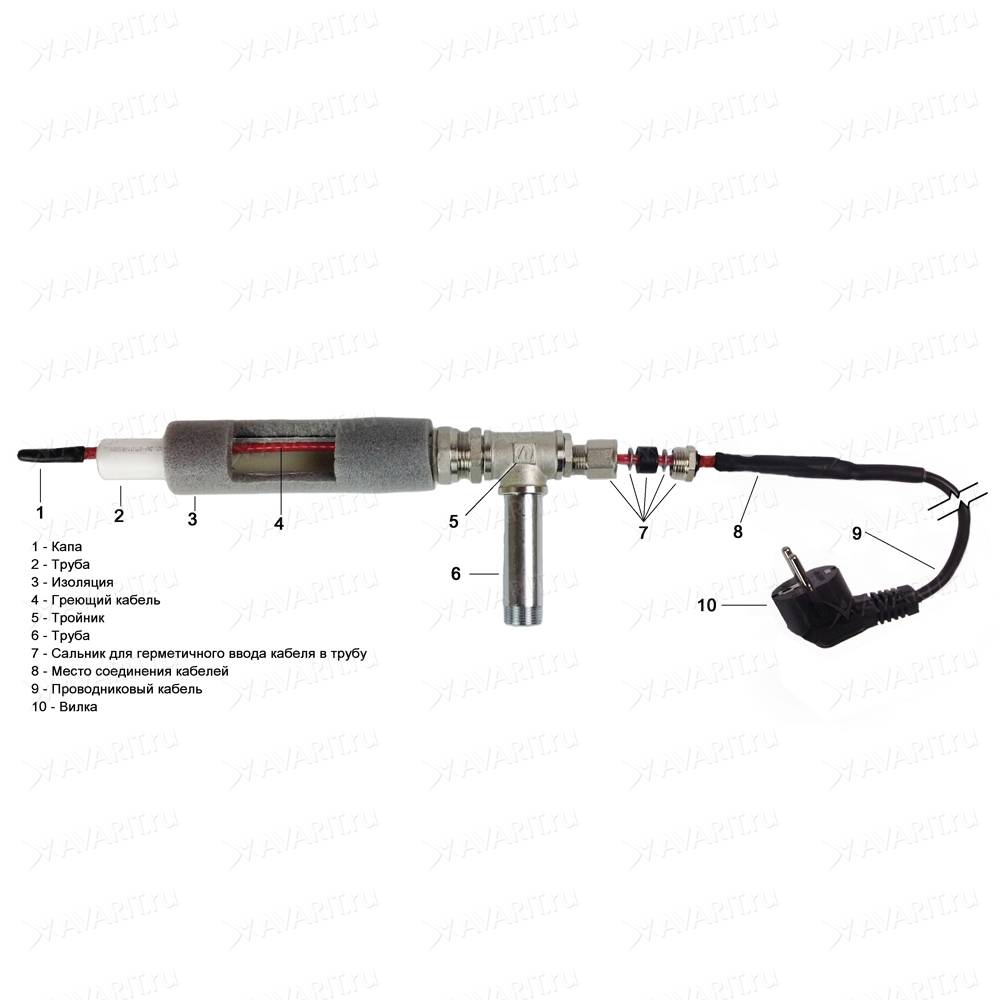 Система кабельной защиты от замерзания водопроводных труб включает в себя терморегулятор и сам кабель.