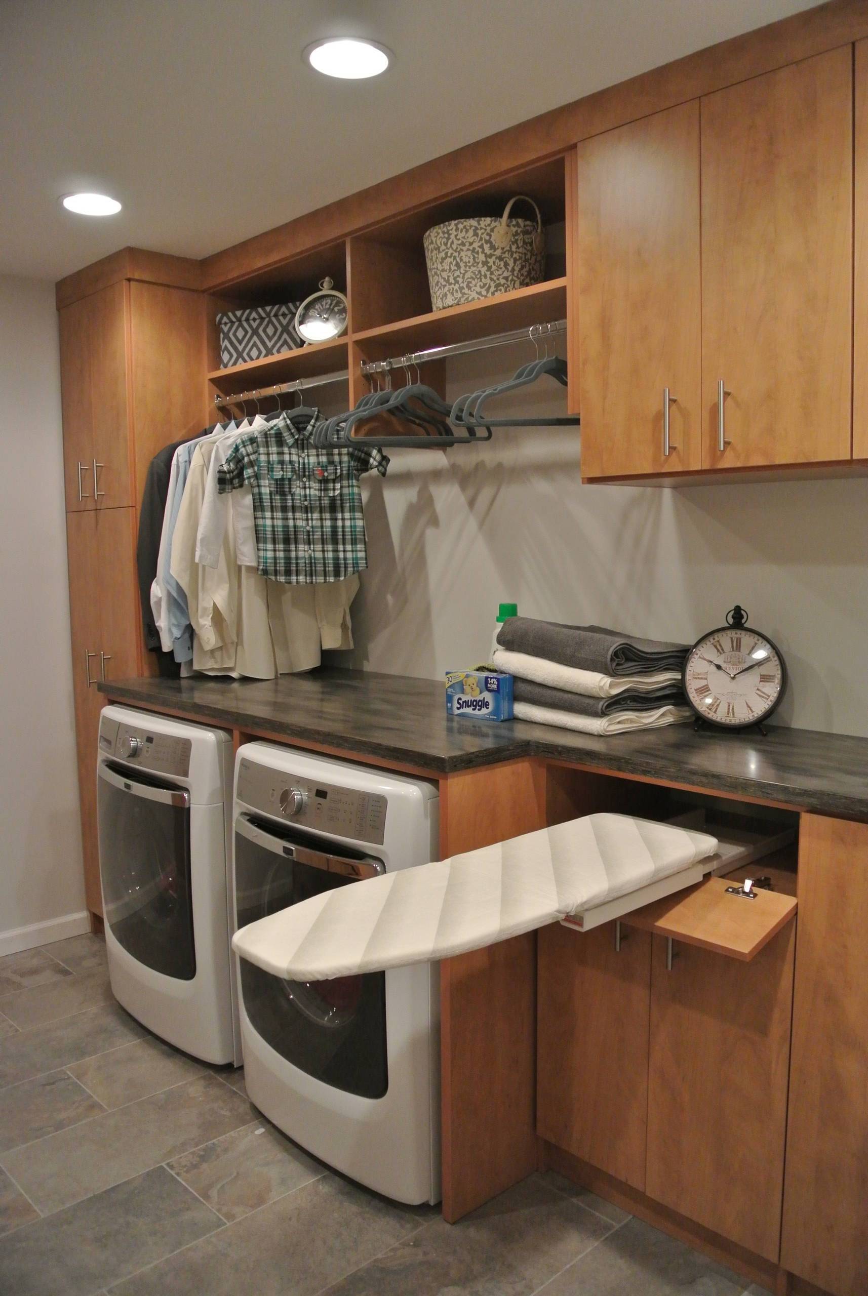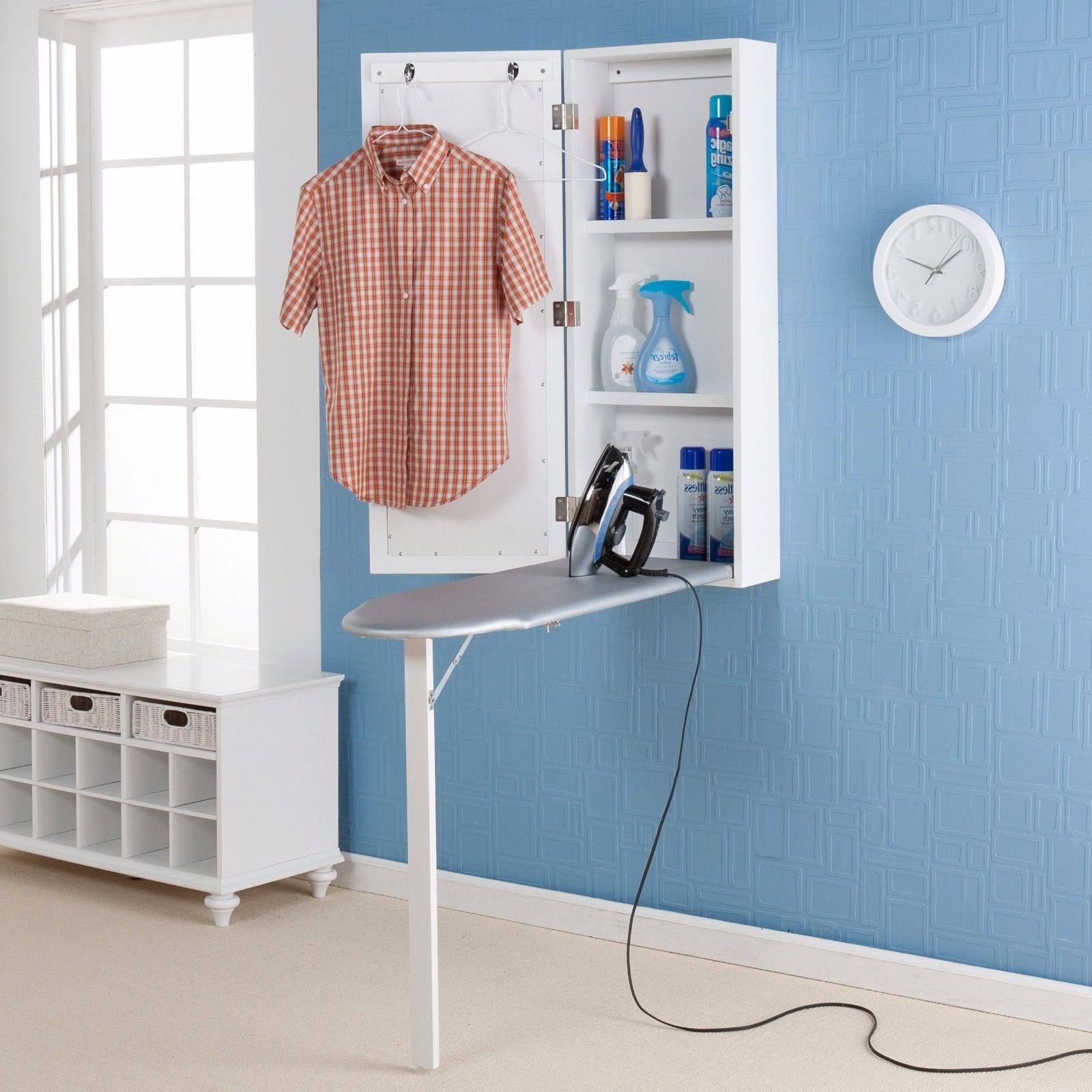 Установка гладильной доски в подвесной ящик или шкаф считается идеальным решением для прачечной. Это позволит гладить на твердой и устойчивой поверхности, и сэкономить пространство, когда вы не пользуетесь ею. Его необязательно располагать именно в прачечной.