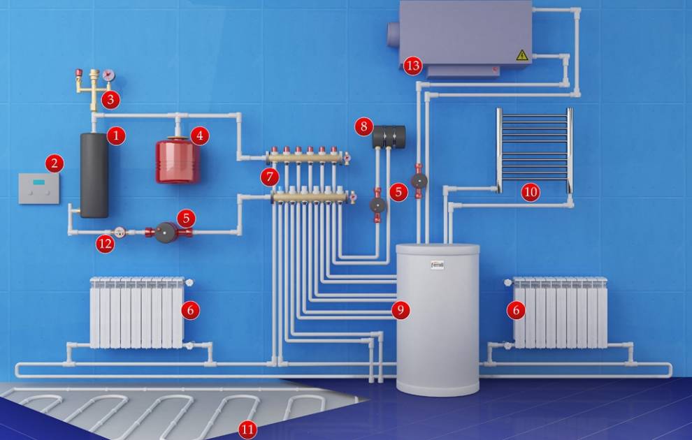 Для разводки по помещению применяются пластиковые магистрали. Если в комнатах имеются стальные трубопроводы, то предусматриваются соединительные муфты из пластика, разобщающие металлические трубы и кожух нагревателя.