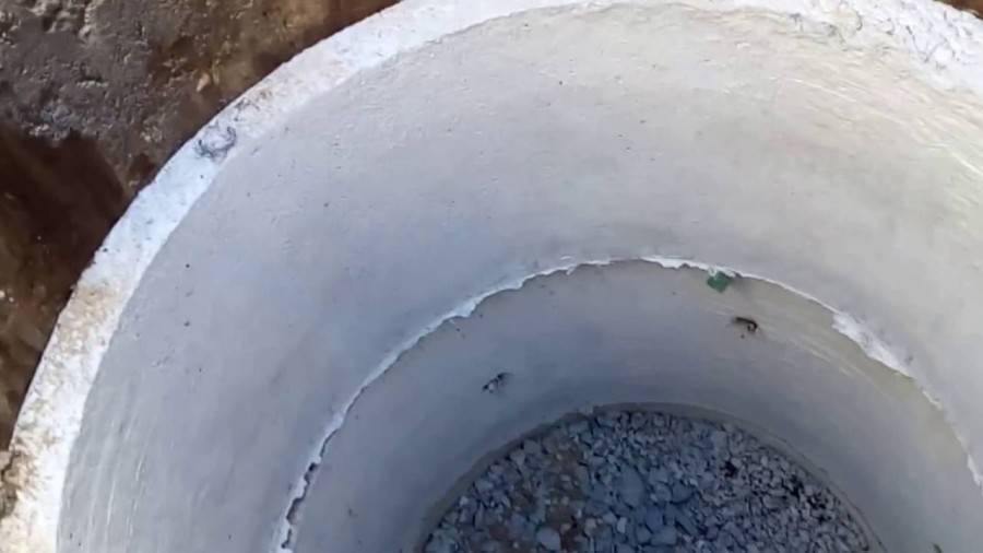 - Теперь на подготовленную основу устанавливаются ж/б элементы. После сооружения колодца в его стенках размечаются и пробиваются отверстия под трубопровод и тройники. Для этого можно использовать болгарку и перфоратор.