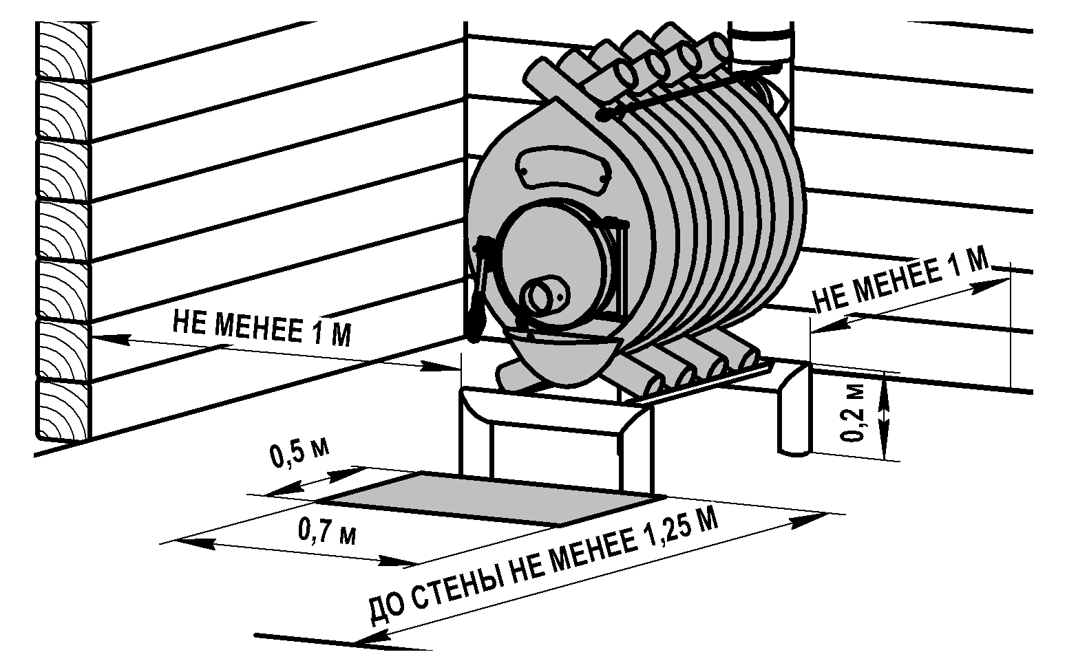 Если предполагается установка печи в жилом помещении, то располагается печь так, чтобы до стен дома оставалось расстояние не менее 0,5м. Если приподнять печь над полом, то это увеличит тягу и соответственно скорость прогрева. Обычно под Булерьян изготавливают небольшой подиум, как сделать его – вопрос возможностей и подручных материалов. Желательно применять негорючие материалы. В идеальном варианте — подиум тоже сварная конструкция.