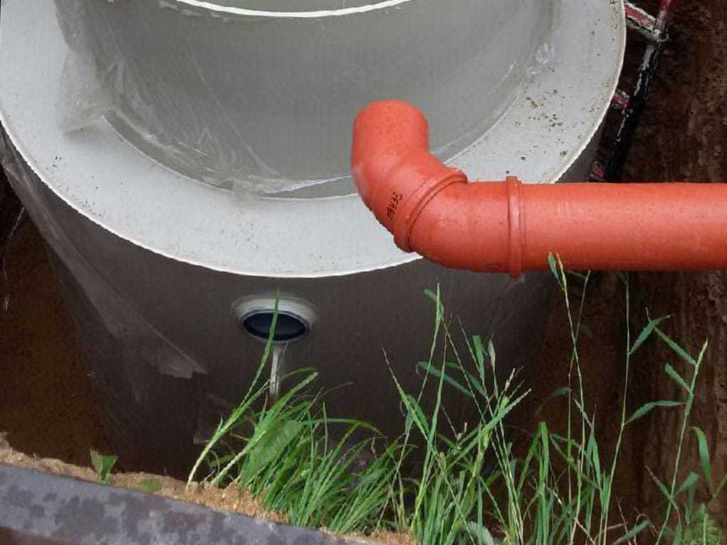 После отвердения бетона в стенках септика устанавливают переливные трубы. Со стороны входа на каждой переливной трубе нужно установить отвод раструбом вниз. Благодаря этому элементу легкие загрязнения, которые после всплытия окажутся на поверхности, в переливную трубу поступать не будут.