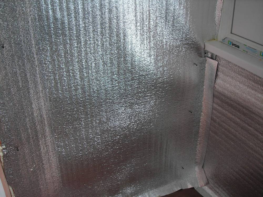 Пенофол с односторонним фольгированием укладывается фольгой внутрь балкона. Срезы полотен монтируются встык, места соединений закрываются фольгированным скотчем