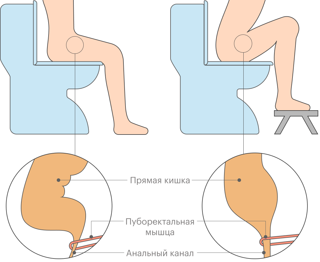 Более привычный способ сидения на унитазе не так сильно сглаживает аноректальный угол — в такой позе какать труднее, чем когда колени приподняты выше таза. Исправить это можно с помощью подножки — на «Яндекс-маркете» она стоит от 453 Р