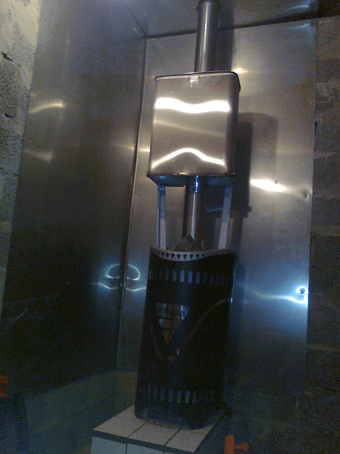 Защитная обшивка предполагает наличие вентиляционных зазоров в 2см от стены до утеплителя, 2см от утеплителя до стального листа. Если необходимо установить печь как можно ближе к стене, делают двойную обшивку из негорючего утеплителя, с помощью керамических втулок выдерживают зазоры в 2-3см и зашивают стальным листом.