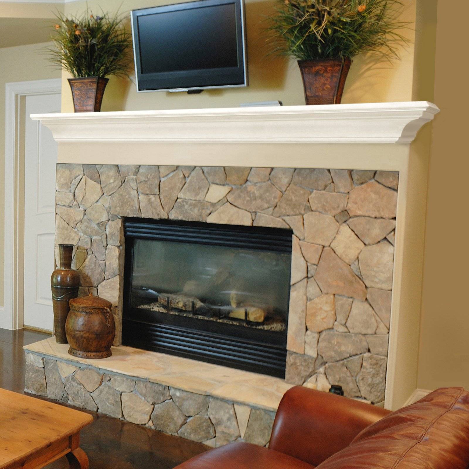 Настоящий природный камень – материал тяжелый, красивый, полностью натуральный. Такая отделка всегда смотрится роскошно, она объемна, достаточно сложна в исполнении, но максимально долговечна – камин прослужит не одному поколению. Устанавливать конструкцию допустимо даже в помещении, которое не отапливается. Камень стоек к истиранию, ударопрочен, а многообразие видов, форм, расцветок позволяет подобрать его под различные интерьерные стили.